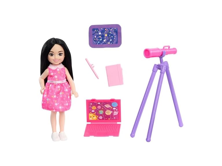 - (1) Barbie Toy Set, Chelsea Can Be Astronomer, Brunette Small Doll with 5 Science-Themed Accessories Including a Telescope