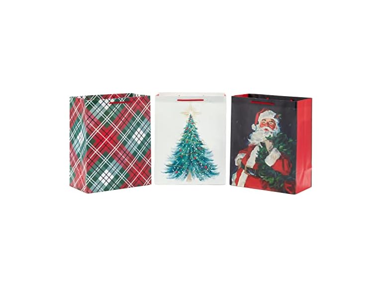 - SET OF 3 BAGS: Purchase includes 3 large Christmas gift bags in coordinating designs: Classic Santa Claus, tartan plaid in red, green and white, and a Christmas tree decorated in red and gold on white