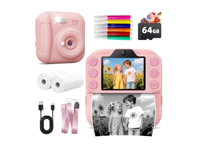 - Idea for Girls Boys Gift: Mini Instant Print Camera as a fantastic gift to provide hours of fun and creativity for kids of ages 3-12 girls or boys. Our kids camera is a great birthday gift, Children's Day gift, Christmas and Easter gift for toddlers and young children boys and girls aged 3-10 years old. It comes with: 1x Kids Instant Print Camera, 2x Printer Paper, 1x Exquisite Gift Packing Box, 1x USB Charging Cable, ,1x 64GB SD Card, 1x Hanging Lanyard, 1x User Manual.