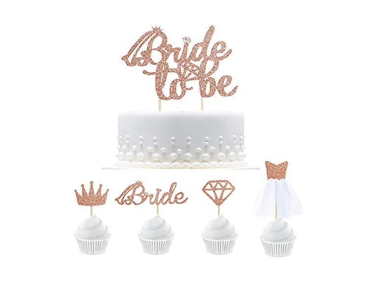 - (1) pinkblume 33 Rose Gold Bride To Be Cake Topper Cupcake Toppers with Diamond Crown Bride Sign 3D Wedding Dress Cupcake Topper for Bridal Shower Wedding Engagement Bachelorette Hen Party Cake Decorations Supplies