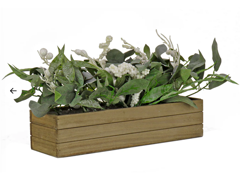This decorative Mixed Leaves and White Berry Centerpiece features a thick grouping of assorted leafy greens mixed with clusters of white berries for added natural appeal. The plantings sprout up from inside a relaxed style wooden box with a simulated soil surface. Set in a charming wooden planter box, it adds a touch of rustic elegance to your holiday decor. Perfect for tables or entryways, this unlit centerpiece captures the spirit of the season beautifully. For indoor or covered outdoor display.