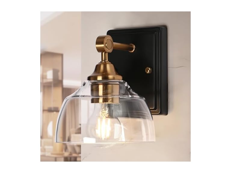 - (1) KSANA Sconces Wall Lighting, 1-Light Black and Gold Wall Sconce Light, Modern Bedroom Bathroom Wall Sconces Indoor with Clear Glass Shade