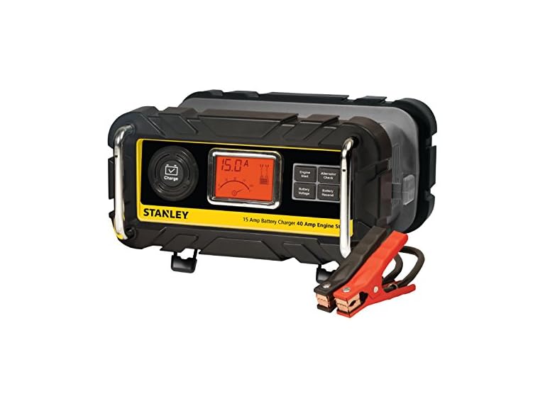 In the box: (1) STANLEY BC15BS Fully Automatic 15 Amp 12V Bench Battery Charger/Maintainer with 40A Engine Start, Alternator Check, Cable Clamps