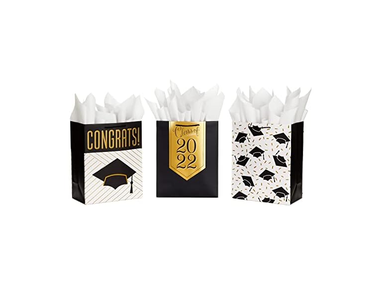 - (1) Hallmark 13" Large Graduation Gift Bags Assortment with Tissue Paper (3 Pack: Black and Gold "Class of 2022," "Congrats," Mortarboards)