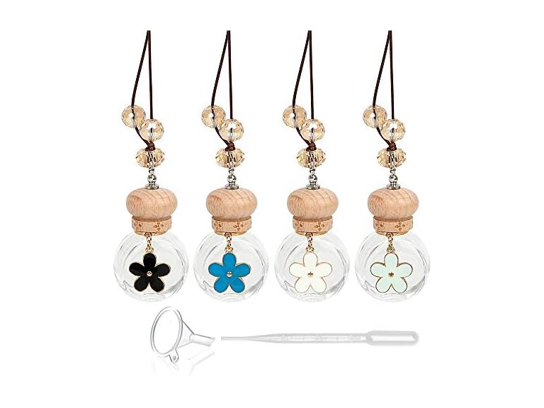 - (1) Furnido 10ml Car Hanging Perfume Air Freshener Diffuser,Essential Oil Flower-Style Pendant Perfume Vials,Thick Clear Glass Fragrance Container With Wooden Caps & Hanging String,FREE Funnel,Dropper-Pack of 4
