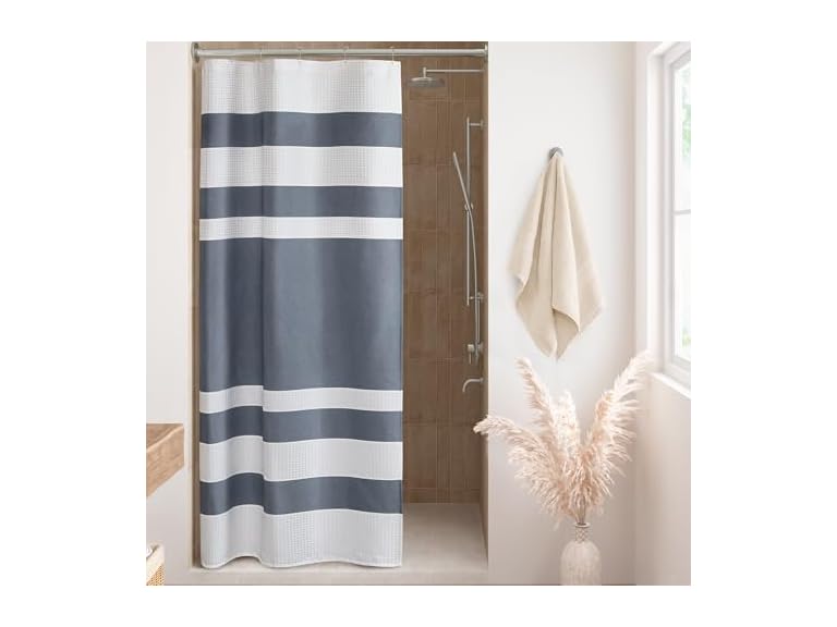 - Modern Farmhouse – The Madison Park Spa Waffle Shower Curtain showcases a waffle weave texture, pieced together in indigo blue & white palette. This stylish design delivers a modern update to your bathroom décor, offering a cozy and inviting ambiance