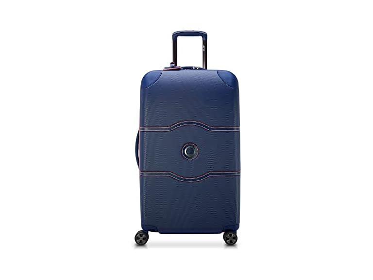 - (1) DELSEY PARIS Chatelet Air 2.0 Hardside Luggage Trunk with Spinner Wheels, Navy, Checked-26 Inch Trunk