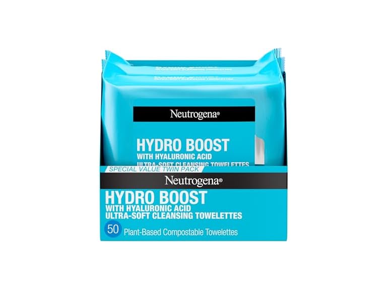 - Pack of Two, 25-count Neutrogena Hydro Boost Face Wipes. Facial cleansing wipes with hyaluronic acid, made with 100% plant-based cloth, these makeup remover wipes eliminate up to 99% of makeup, oil, and sunscreen, boosting hydration for 24 hours