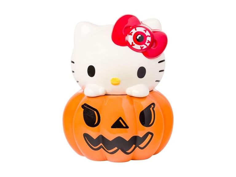 - HELLO KITTY FALL: This ceramic cookie jar features an adorable fall design. Cookie jar features a cute pumpkin design and is complete with a Hello Kitty lid. Hello Kitty is featured wearing a spooky Halloween bow.