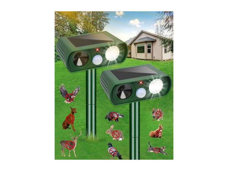 - 5. Humane & Eco-Friendly Protection Safeguard your property without harm—this device uses ultrasonic waves and light to deter rabbits, deer, raccoons, and more. Chemical-free, pet-safe, and ideal for gardens, orchards, and lawns.