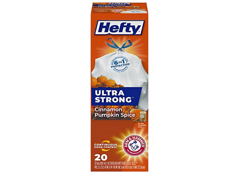 - 13 GALLON GARBAGE BAGS—This package contains 20 Hefty Ultra Strong, Cinnamon Pumpkin Spice scented trash bags.
