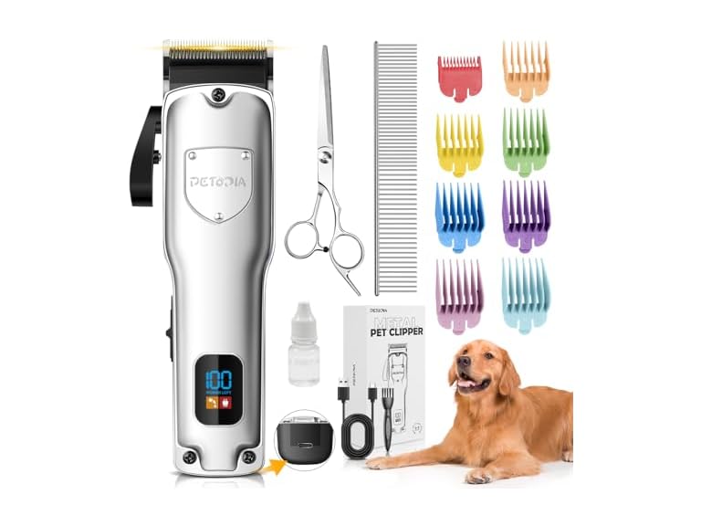 - (1) Petopia Dog Clippers for Grooming, Pet Grooming Supplies Kit, Professional Grooming Clippers for Thick Heavy Coats Low Noise Rechargeable Hair Trimmers with Ceramic Blade for Dogs Cats Animals