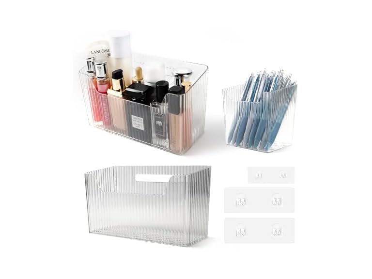 - Complete 3-Pack Versatility More than just shower shelves - this set organizes your entire home! Use the plastic shower caddy units in the bathroom, as cabinet door organizers in the kitchen, or as general bathroom organizers for toiletries. The modern transparent design blends seamlessly with any decor. Includes 3 organizers - perfect for creating coordinated storage throughout your home!
