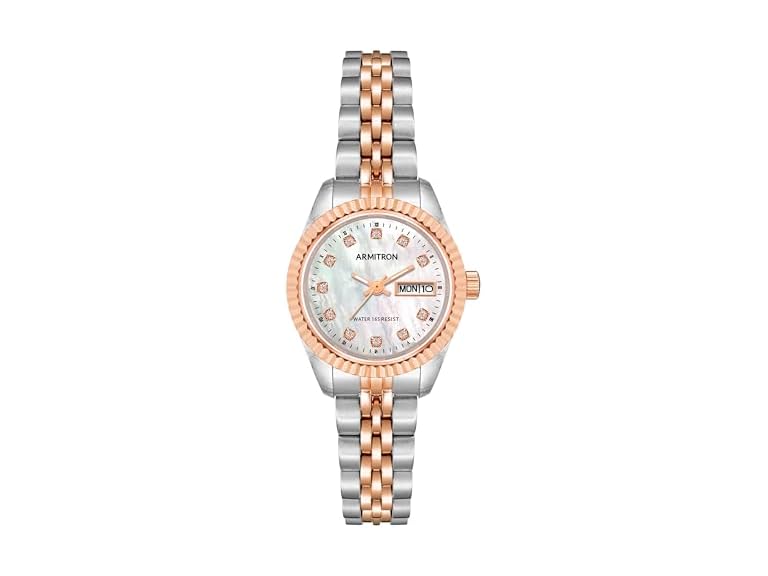 - Mother-of-pearl dial with day/date calendar window; rose gold-tone hands and genuine crystal markers; black outer minute track