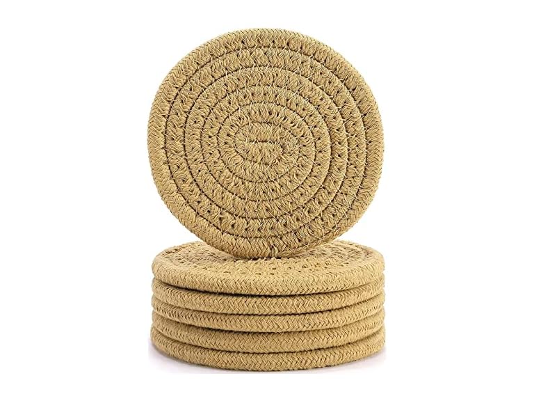 - (1) Casaphoria Cotton Woven Coasters for Drinks, Absorbent, Heat-Resistant, 6Pcs, Brown, Round, 4.3inch