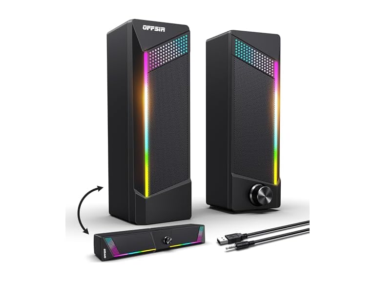 - 【2 in 1 PC Speakers】OFFSIR computer speakers can be a soundbar after easily splicing, innovative 2-in-1 design, which is convenient for you to layout the computer desktop. With compact size, OFFSIR RGB gaming Speakers are ideal for the desktop PC laptop computer.