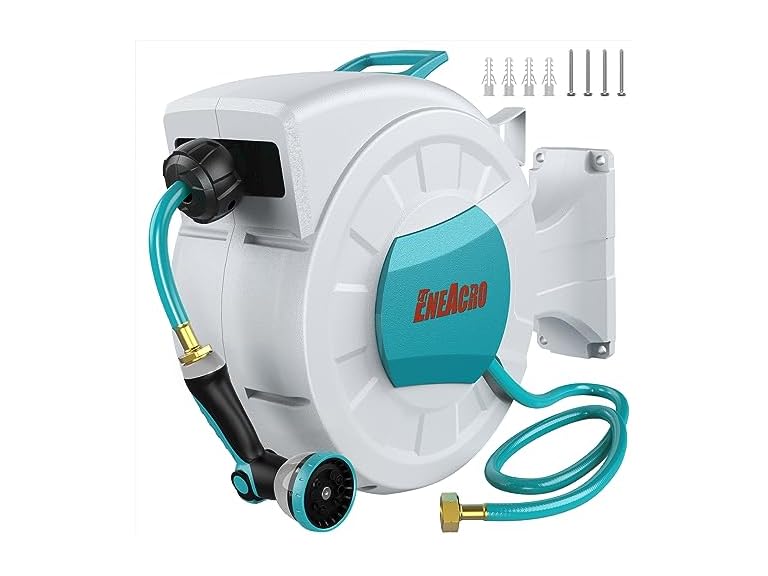 - 【EFFORTLESS LOCK & SMOOTH AUTO-REWIND】This retractable garden hose reel lets you lock the hose at any length with ease—just pull it to your desired spot, and it stays securely in place. No need to hold or readjust! The heavy-duty auto-rewind system ensures smooth, hassle-free retraction and has been tested for over 5,000 cycles—making it 30% more durable than competing hose reels.