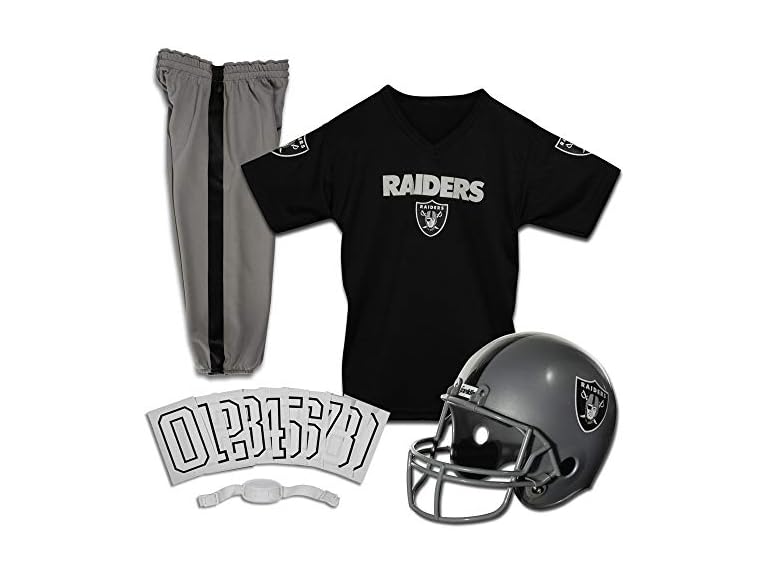 - (1) Franklin Sports Las Vegas Raiders Kids Football Uniform Set - NFL Youth Football Costume for Boys & Girls - Set Includes Helmet, Jersey & Pants - Large