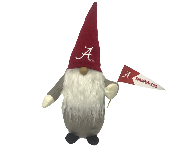 It's game day! Looking sharp in school colors and proudly carrying his team flag, this gnome is ready to cheer on the home team! Bottom weighted, this soft and cuddly gnome will sit perfectly on any desk, shelf or tabletop. Beautifully embroidered and hand crafted, this adorable 16" Gnome is sure to provide many seasons of pleasure.