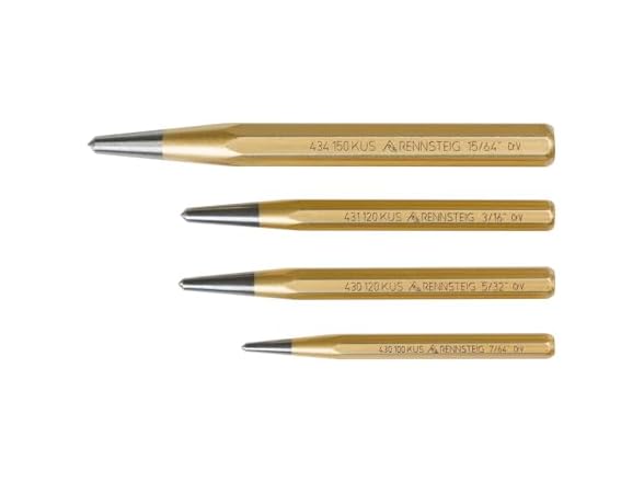 Where precision meets durability with every strike, the 4 piece center punch set is built to handle challenging tasks. This set includes center punches with the following diameter: 7/64”, 5/32”, 3/16” and 15/64”. For exact marking of a drill point and guidance of the drill bit. Center punches are used to create permanent marks or locations when dissassmbling engine parts. The octagonal shape is easier to grip when striking with a hammer and also prevents the tool from rolling away when placed on a surface. The tip is ground and polished. The material core design prevents mushrooming of the striking head. Tools are tempered to a hardness of 54 to 58 HRC - not just at the tip but throughout the entire length of the tool. Forged from top quality hardened chrome vanadium steel.. Compiles with DIN 7255 standard. Set includes four (4) center punches: 9R 430 100 KUS (7/64" x 4"), 9R 430 120 KUS (5/32" x 4 3/4"), 9R 431 120 KUS (3/16" x 4 3/4"), and 9R 434 150 KUS (15/64" x 6"). RENNSTEIG is a member of the KNIPEX Group that specializes in the design and manufacturing of high quality tools..