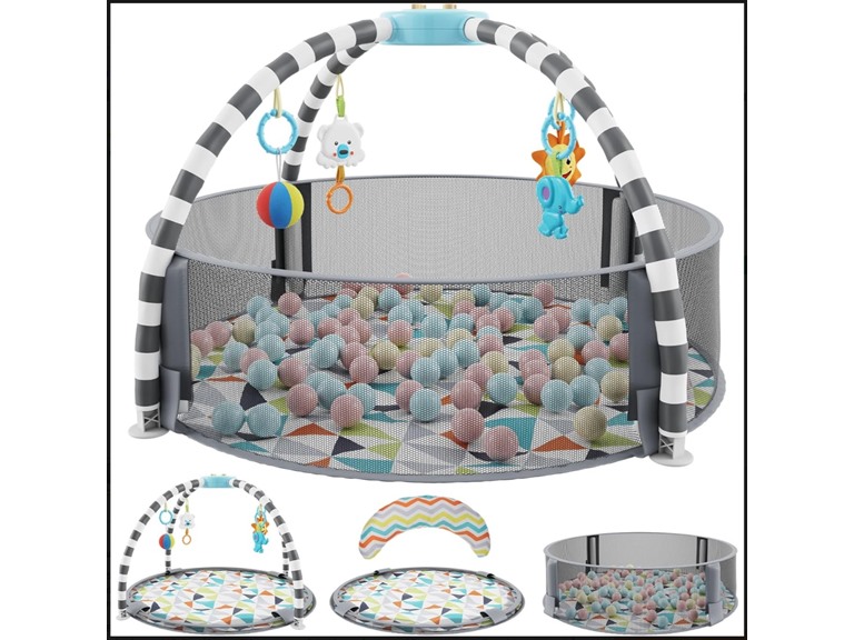 - 5 in 1 Baby Play Gym and Ball Pit - Activity Gym with 6 Toys, Balls, Tummy Time Pillow Play Mat - Easy to Set Up Baby Activity Mat