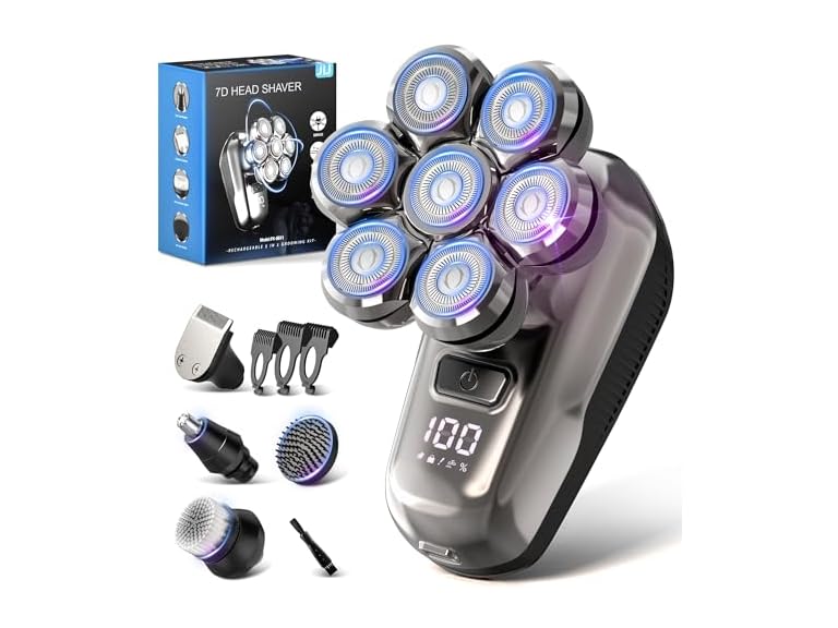 - 5-in-1 Grooming Kit: This multifunctional electric shaver comes with 5 interchangeable heads, 7D head shaver, hair trimmer, nose trimmer, massage brush, and cleaning brush. Powerful enough for daily use, it delivers a fast, smooth shave—and gift idea for your husband