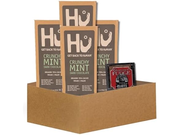 - 𝗖𝗛𝗢𝗖𝗢𝗟𝗔𝗧𝗘 𝗦𝗘𝗧 – This gift set includes 4x Hu Chocolate Crunchy Mint 2.1 oz and Claeys Old Fashioned Chocolate Fudge 1.75 oz bundle with vegan and organic chocolate options for snacking and indulgence. (Packaging May Vary)