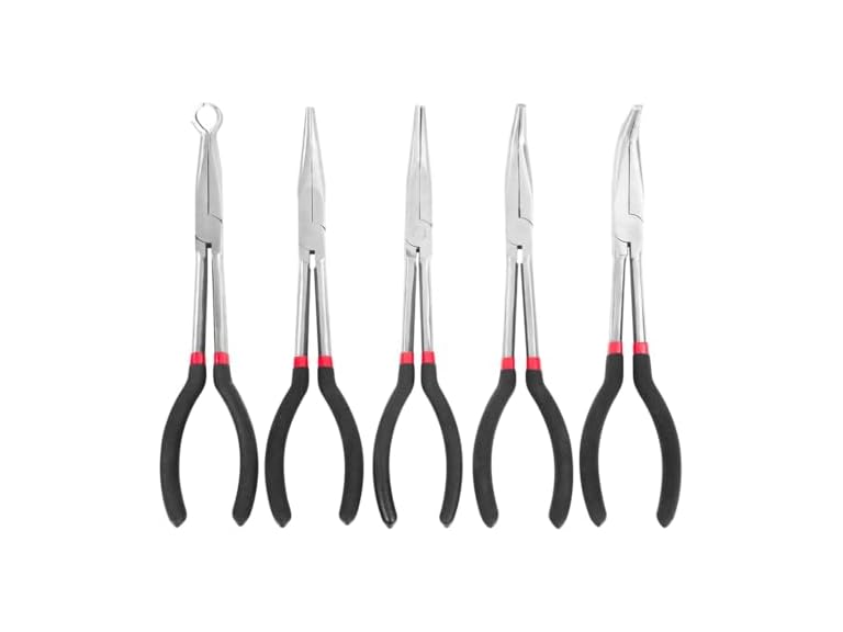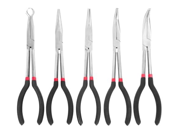 - (1) 5-Piece Long Reach Needle Nose Pliers Set, 11-Inch Pliers with Straight, 25, 45, 90 Degree, and O-Typed for Tight Spaces