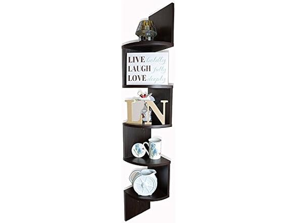 Our 5 tier wall mount floating corner shelf makes space utilization possible from any corner. Creative design provides space saving solution for small area. Display collectibles, photos, toys, awards, CDs, videos, decorative items and more. Attaches to both sides of the wall using only a few screws. Contemporary Espresso finish makes it the ideal accent for any living space. Care instructions: wipe clean using damp cloth. Avoid using harsh chemicals.
