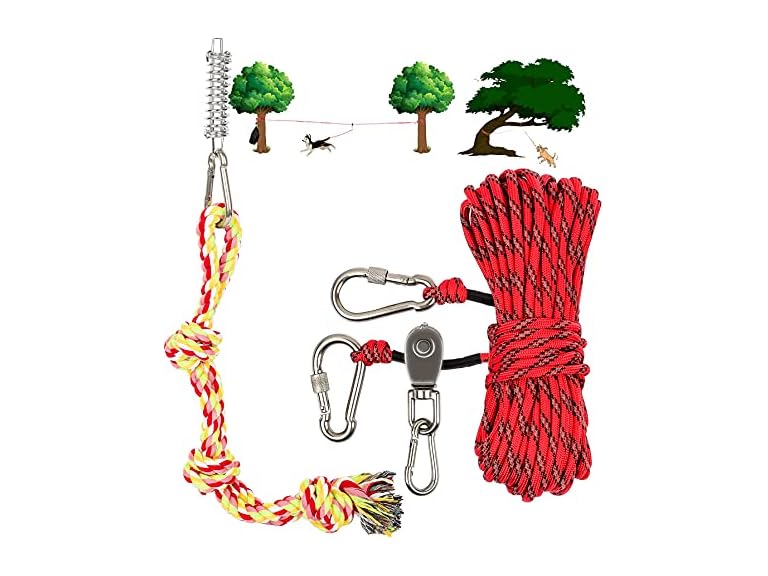 5.Wrap one end of the dog cable around a tree trunk, and the other end around another tree trunk, and then hang it on a tree limb. Finally, connect it to the dog rope toy.