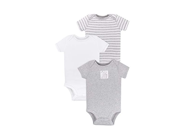 - (1) Lamaze Baby Super Combed Natural Cotton Short Sleeve Bodysuit, Snap Closure, 3 Pack, Grey/White Stripes and Solid, 6 Months