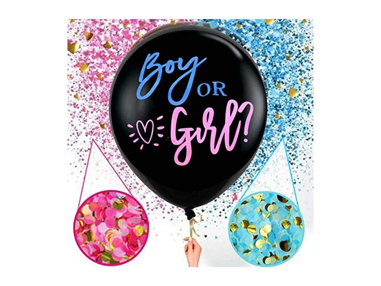 - Build up suspense for the big news before revealing it with this Girl Gender Reveal Balloon with Confetti! Made of latex, this balloon features a ''Girl Or Boy?'' headline against a black background; inside, there's pink paper confetti that guests won't be able to see until the balloon pops; inflate this large balloon and use it to reveal the gender of your baby at the gender reveal party!