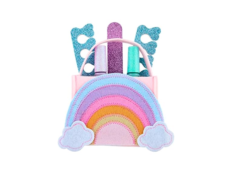 - The girly girl in your life needs this Rainbow Kid's Nail Polish Set. The set comes with five pieces. The set comes with a felt carrier tote. The tote features a Rainbow image. The tote holds two bottles of water based nail polish. The nail polish features fun colors. The nail polish is non-toxic. The set includes a pair of toe separators. Finally, we've included a nail file. This set is intended for children ages 3 and older. The tote is made from 100% polyester. The set can be spot cleaned with a damp cloth. The set measures 5 3/20" x 3 3/4".