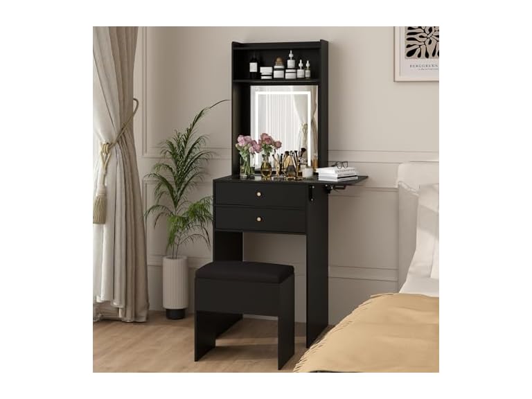 - Additional Space: Apart from mirror lights and chairs, this small space vanity table also has a side panel that can be folded and opened, even if it is a mini dressing table, it also gives you enough space to make up