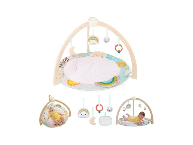 - (1) B. toys – Wooden Baby Gym & Soft Play Mat with 5 Hanging Sensory Toys for Newborns – Sunrise to Sunset Design – Tummy Time & Motor Skills – for Babies 0+ Months