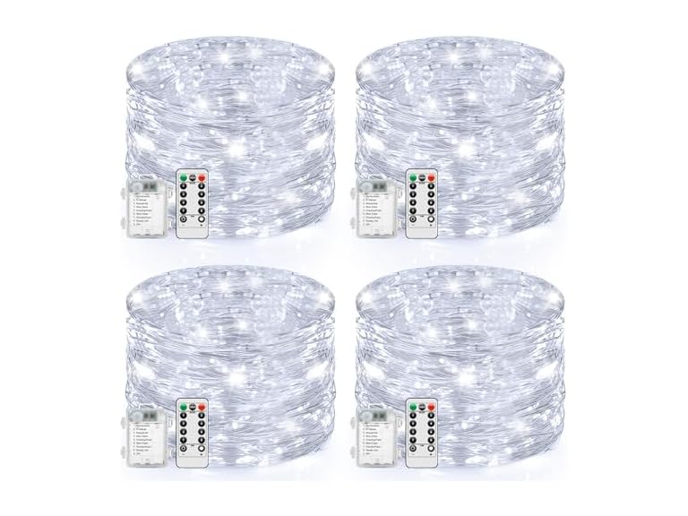 - Ultra-Bright and Durable 4-Pack Battery Fairy Lights: Each box contains 4 strands of 33 ft fairy lights battery operated, each with 100 LEDs, and 2 remote controls. The twinkle lights come pre-wound on cardboard for a tangle-free experience, making setup quick and simple. Each LED string lights requires 3 AAA batteries (not included)