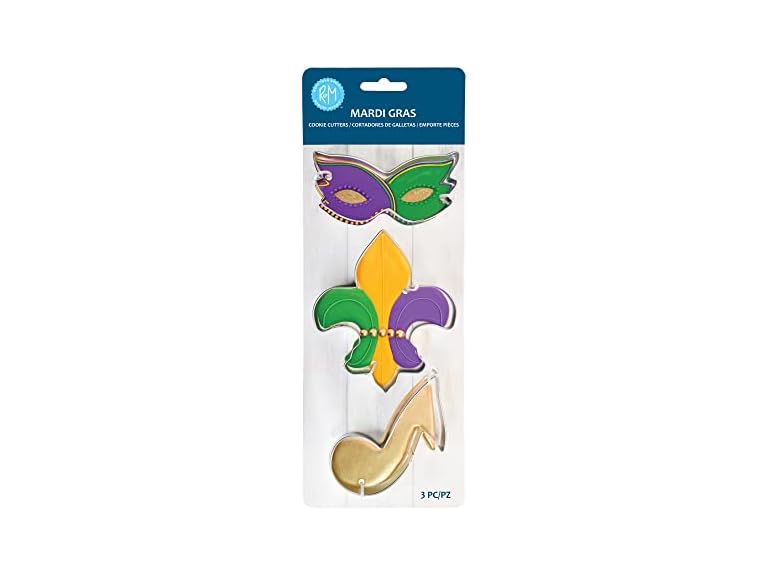 - This 3-piece set includes 3.5" Mardi Gras mask, 4" fleur de lis, and 3.5" music note cookie cutters