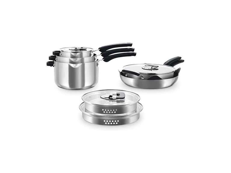- INCLUDES: 12” Fry Pan, 1.5QT Sauce Pan, 3QT Sauce Pan, 5QT Sauce Pan, 3.5QT Sauté Pan, 4 Stackable Strainer Lids, Silicone Trivet, Instruction Manual and Recipe Cards.