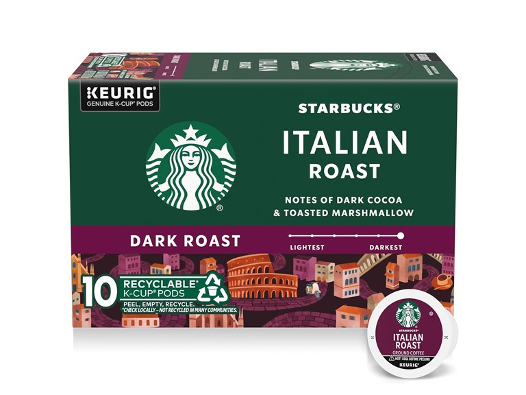 - (1) Starbucks K-Cup Coffee Pods, Dark Roast Coffee, Italian Roast, 100% Arabica, 1 box (10 pods)