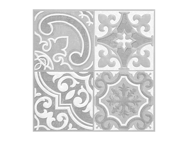 - Embossed peel and stick backsplash tiles with an eclectic, bohemian design in shades of grey