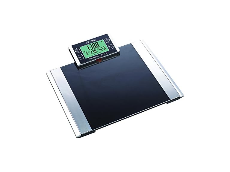 - (1) 440 lb Capacity Digital Body Fat and Hydration Monitor Bathroom Scale with Extra Wide Tempered Glass Surface and Detachable Display BFS308