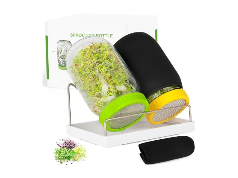 - COMPLETE SPROUTING KIT - Includes 2 Glass jars, 2 screen sprout lids, 1 stainless steel stand, 1 drip tray, 2 blackout sleeves.(SEED NOT INCLUDED)