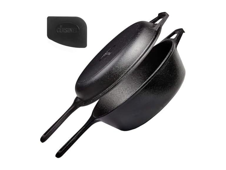 - (1) Cuisinel Cast Iron 2-In-1 Multi Cooker - 3-Quart Dutch Oven and Skillet Lid Set Oven Safe Cookware + Black Pan Scraper - Use As Dutch Oven and Frying Pan - Indoor and Outdoor Use - Grill, Stovetop