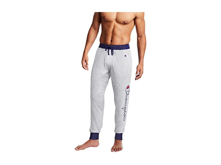 - (1) Champion Men's Sleep Rib Cuff Jogger Pant, Oxford Gray Heather/Athletic Navy-Script Logo, Large