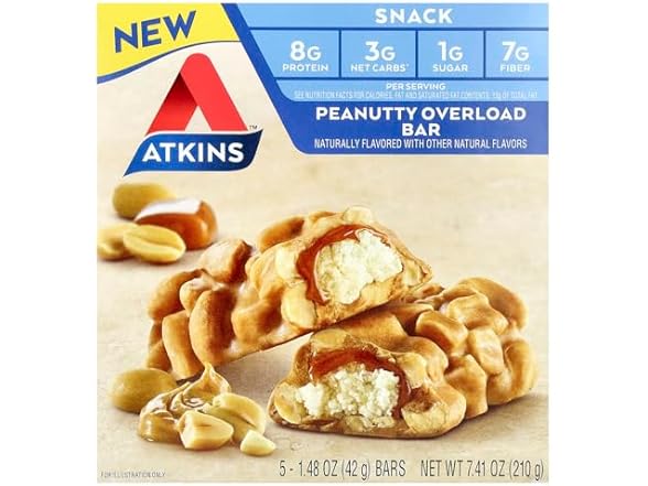 8 g Protein Per Serving 3 g Net Carbs* Per Serving 1 g Sugar Per Serving 7 g Fiber Per Serving Naturally Flavored with Other Natural Flavors Today's Atkins Doing Atkins doesn't mean you're on a diet. Countless people have lost weight living the Atkins lifestyle, because at Atkins we know that when we eat better, good things happen. Limiting the amount of sugar and both simple and refined carbs can help minimize spikes in blood sugar. And that's a good thing. Reach for Atkins Anytime snacks whenever and wherever you're in the mood for something chewy, salty, sweet, or crunchy; because the impulse to snack can be the body's way of telling you it could use a little boost. In fact when hunger strikes, making great choices like Atkins Anytime snacks can help give your body just that. Anytime snacks are a delicious source of protein that let you feel good about refueling between meals. So now enjoy a little Peanutty Overload flavored indulgence anytime, anywhere. Anytime Snacks Chewy, crunchy, sweet & salty snacks - anytime, anywhere. *Total Carbs (16 g) - Fiber (7 g) - Sugar Alcohols (4 g) - Allulose (2 g) = 3 g Atkins Net Carbs