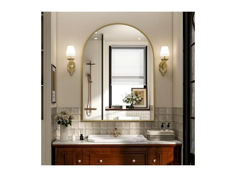 - (1) Arch Bathroom Mirror, 20x30 inch Arched Bathroom Mirror/Wall Mounted Vanity Mirror - Arch Metal Frame Wall Mirror for Bathroom Bedroom Living Room, Gold