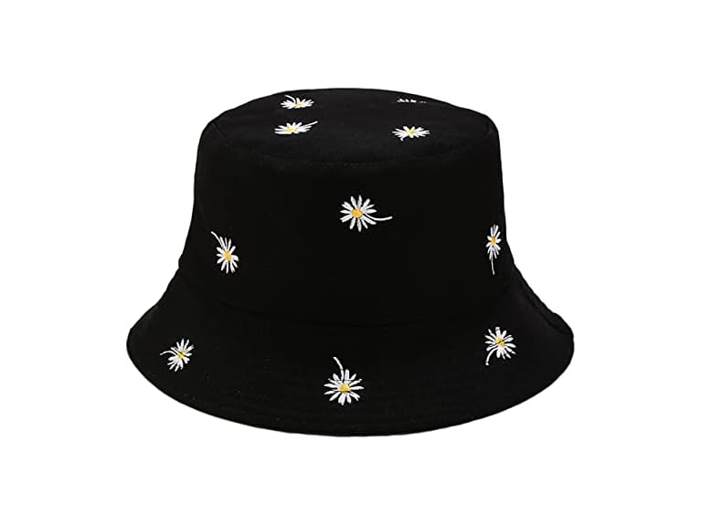 - Flower Bucket Hat Daisy Embroidery Reversible Hats Packable Summer Travel Beach Sun Hat Outdoor Cap (Black/Black)