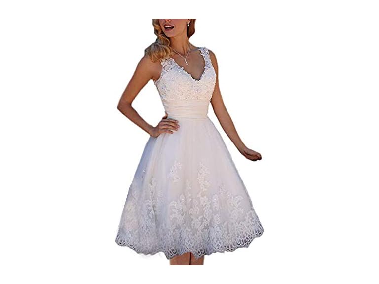 - (1) Short Lace Wedding Dresses Knee Length Travel Tulle Rhinestones V-Neck Lace Up Bride Gowns Vintage Dress White