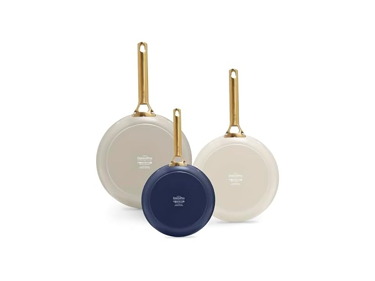 - (1) GreenPan 3 Piece Ceramic Cookware Set, Non Stick Frying Pans (8” 10” & 12” Skillets), PFAS-Free Non-Toxic Induction Cookware, Hard Anodized, Kitchen Pots, Dishwasher Safe, Navy, Taupe, Cream
