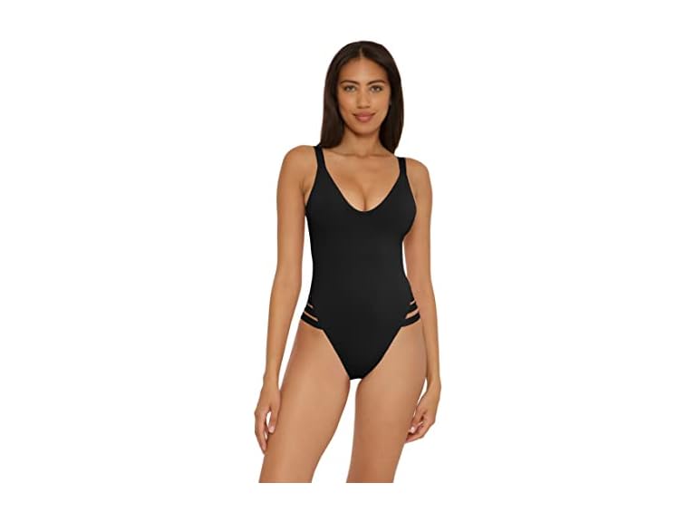 - (1) BECCA Women's Standard Color Prism High Leg One Piece Swimsuit-Scoop Neck, Open Back Design, Bathing Suits, Black, Large